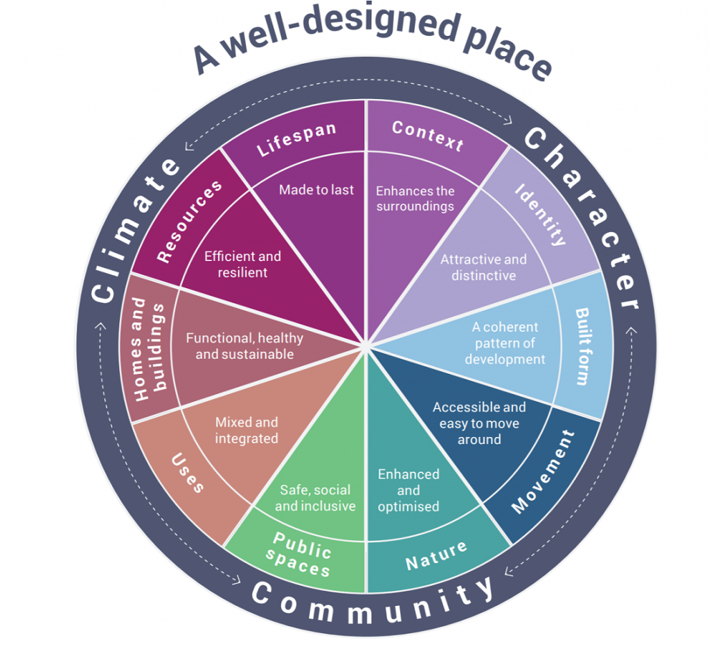 The design guide introduces 10 characteristics for well designed places as set out in the diagram and explained in depth in the design guide.